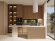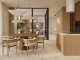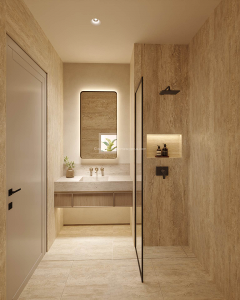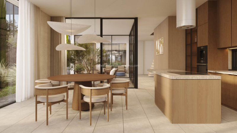 The villa itself showcases an elegant and contemporary design, with a unique ground floor layout that perfectly blends indoor and outdoor living. The living area and the kitchen/dining space are separated by a covered courtyard style area, creating a beautiful place to relax. The floor to ceiling glass walls also allow natural light to flood the interior while creating a seamless connection to the outdoor areas. The stylish kitchen is designed to a high specification, complete with a central island and integrated appliances, ideal for modern living and entertaining.