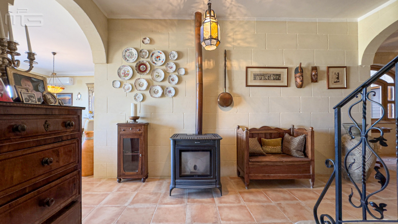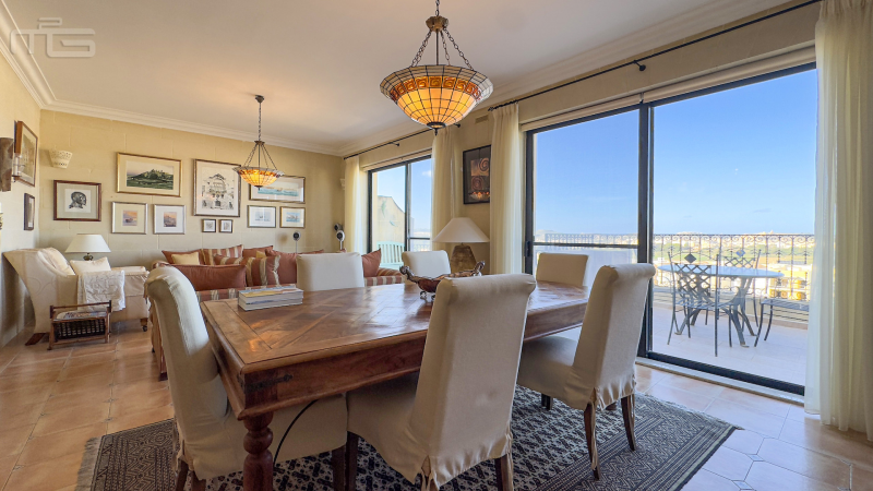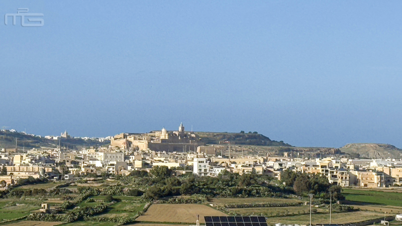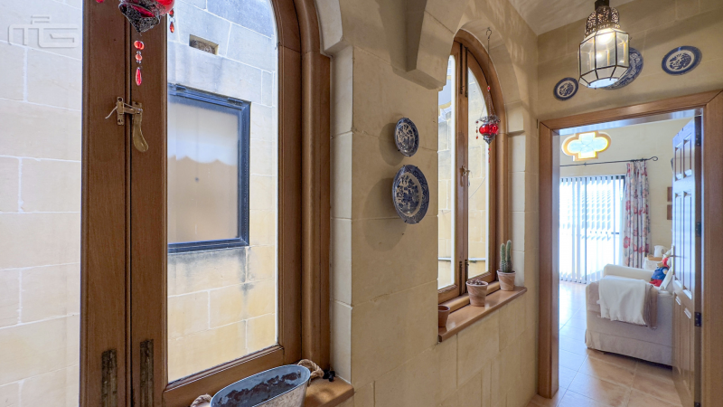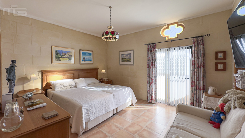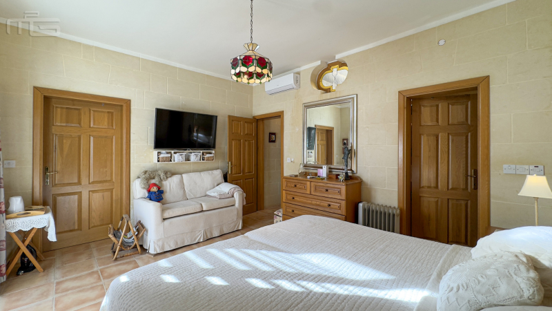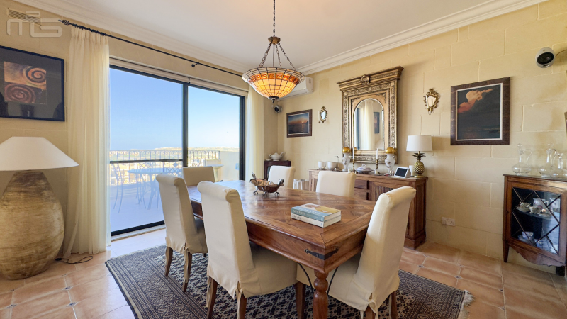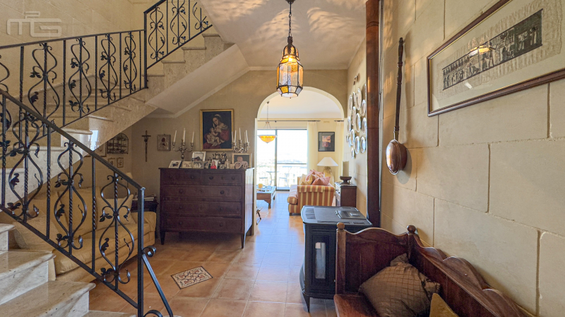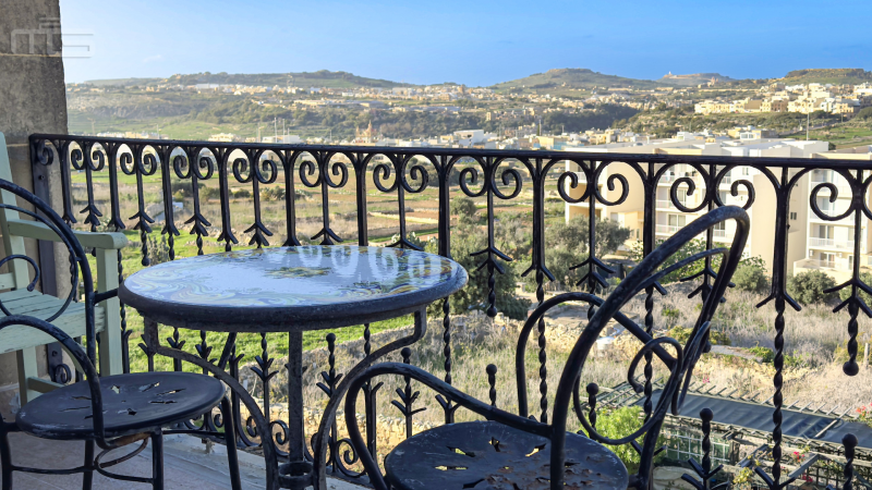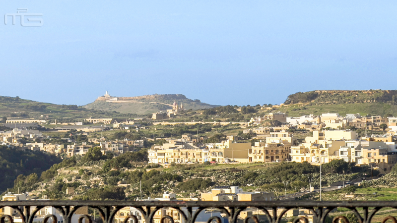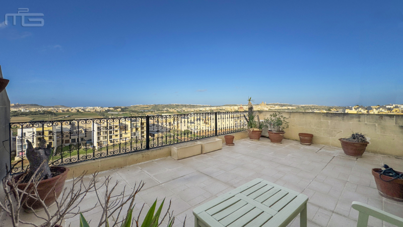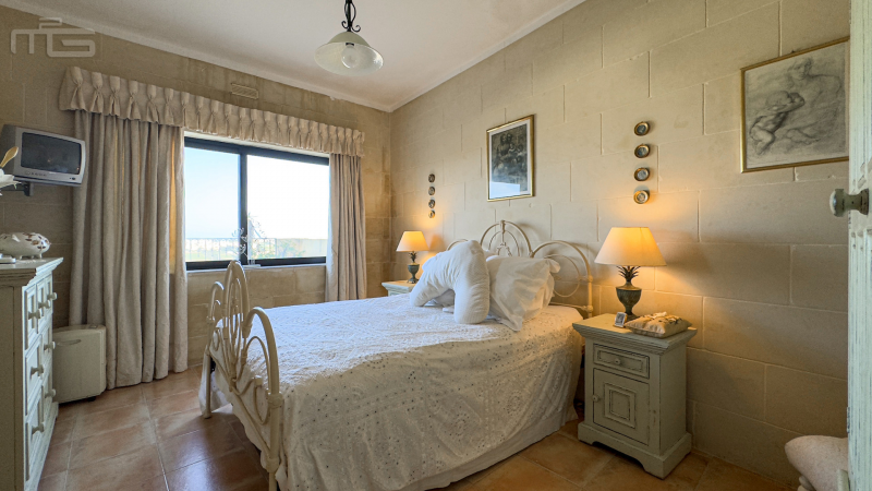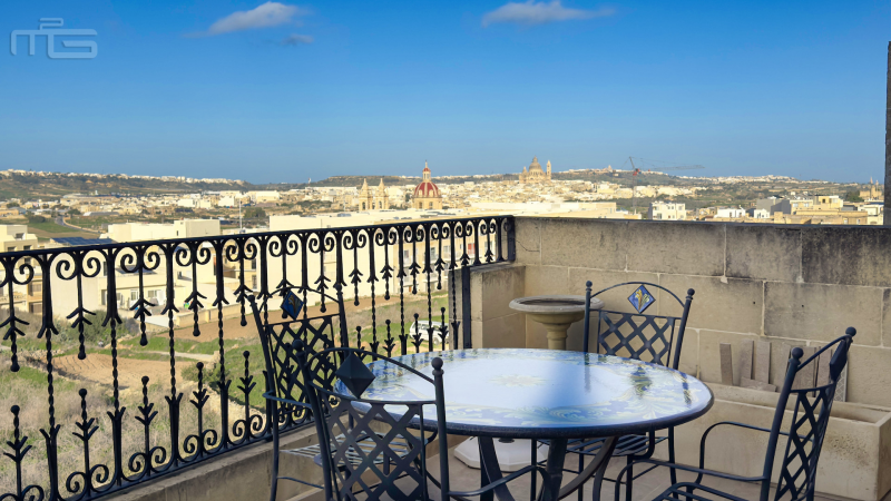 The main living and dining area opens up beautifully, with large doors that flood the room with natural light and lead directly onto a spacious front terrace. From here, the views are nothing short of breathtaking — a sweeping 180-degree panorama stretching across Gozo. You can see the open ODZ fields, the cliffs of Xlendi Bay to the west, the village of Nadur to the east, and straight ahead, the Citadel of Victoria, the island’s lighthouse, and the village of Żebbuġ.