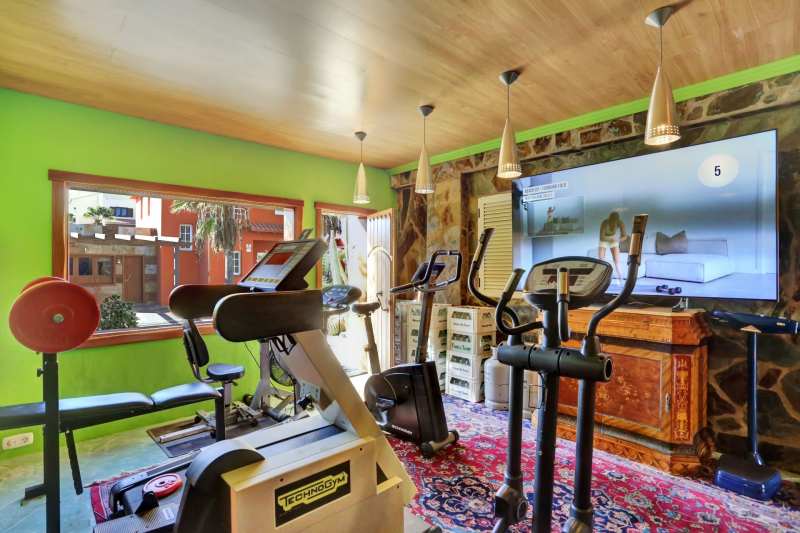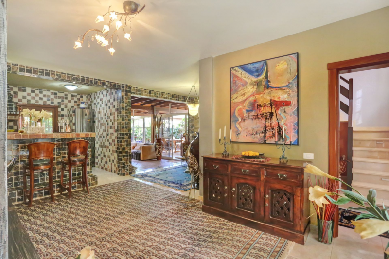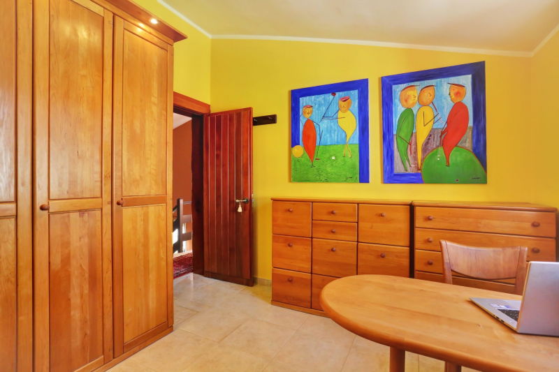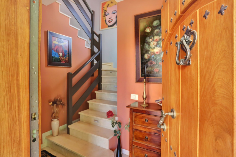 This floor also features a convenient storage room and a private parking space. Several access points lead to the large outdoor area, where a beautifully landscaped garden surrounds the villa.